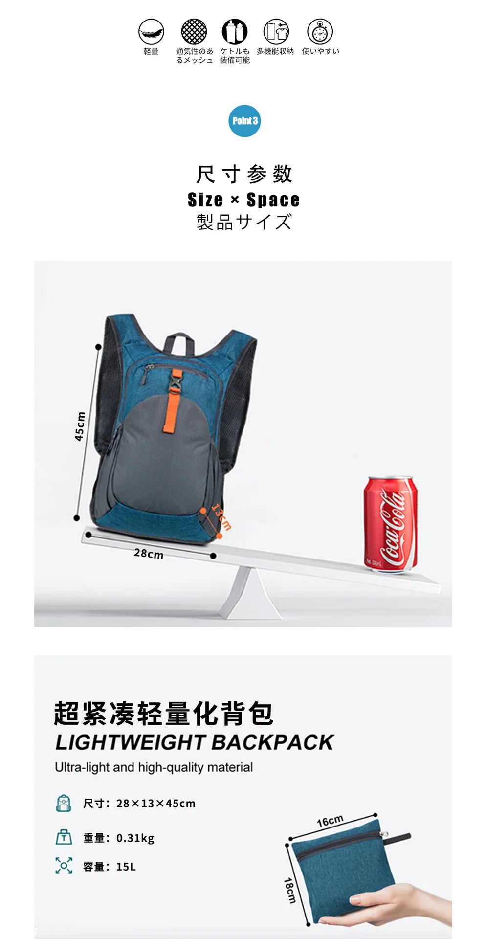 This backpack's packable feature allows for easy storage when not in use, making it perfect for travelers and outdoor enthusiasts.