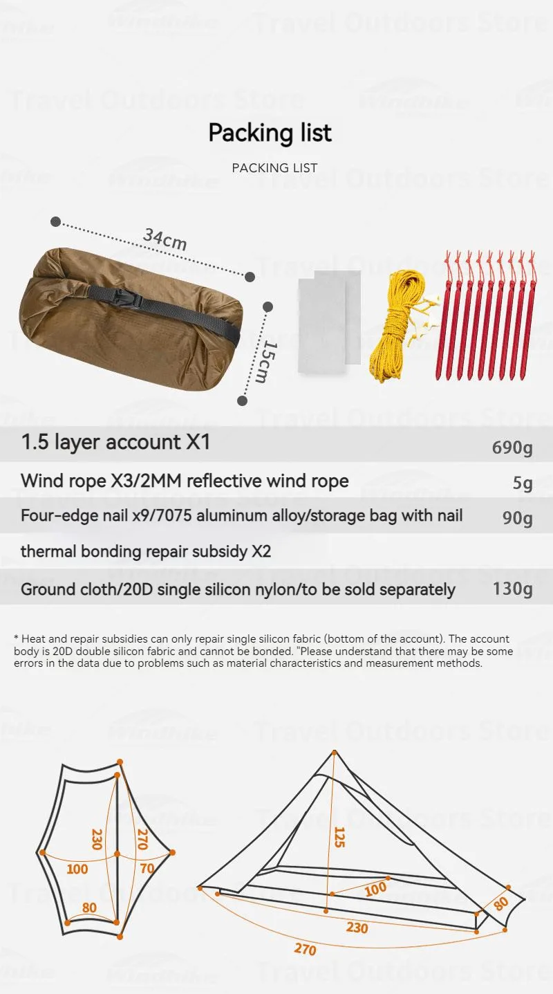 Accessories:1.5 Layer Tent *1+Wind Rope *3+Ground Nail *9+Storage Bag *1+Hot Fit Patch *2+ Nail Storage Bag*1
