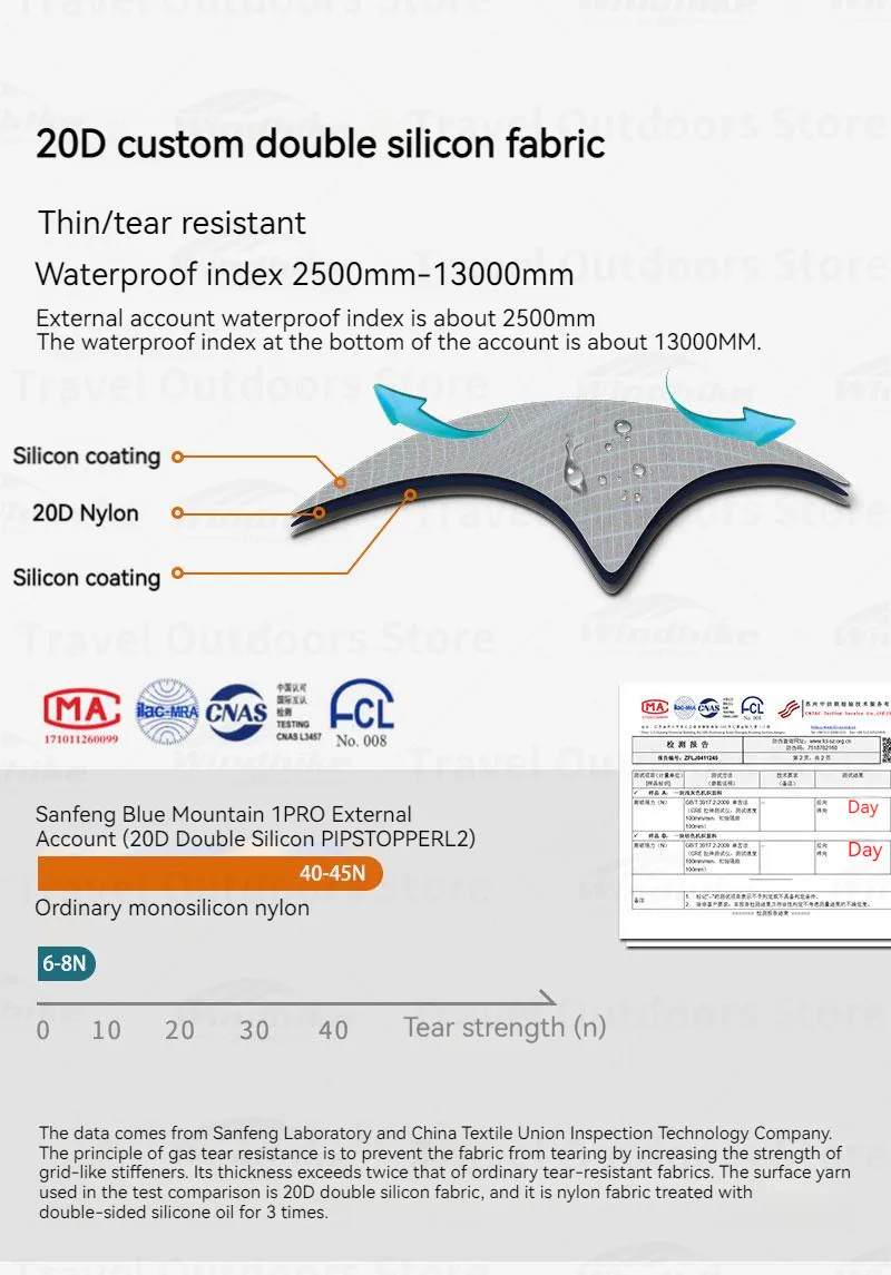 Outer Tent: 20D Customized Double-sided Silicon Coated Fabric (Waterproof Index 2000mm)