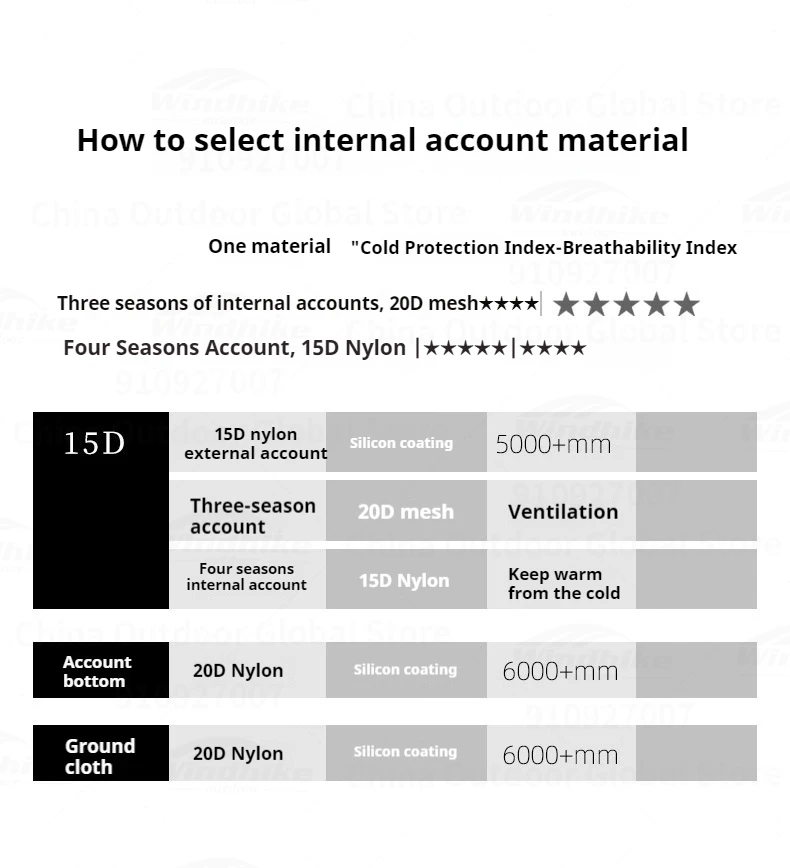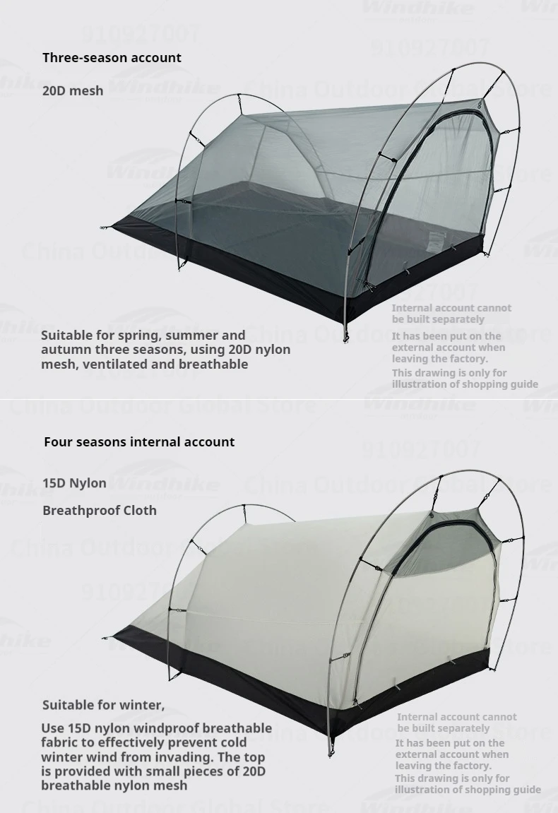 Inner Tent Material: Three Seasons/20D Mesh, Four Seasons/15D Nylon Breathable Cloth