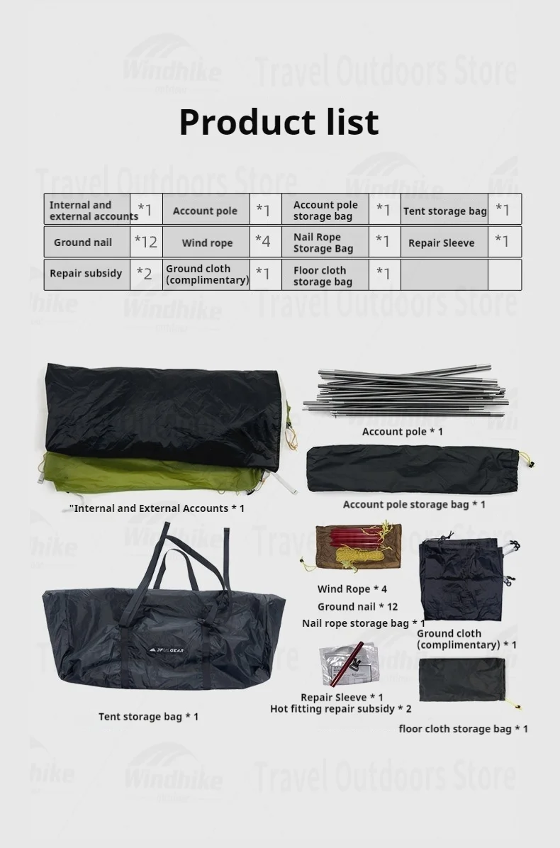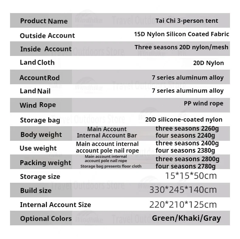 Main Weight: Main Tent + Inner Tent + Poles: Three-Season 2260g / Four-Season 2240g