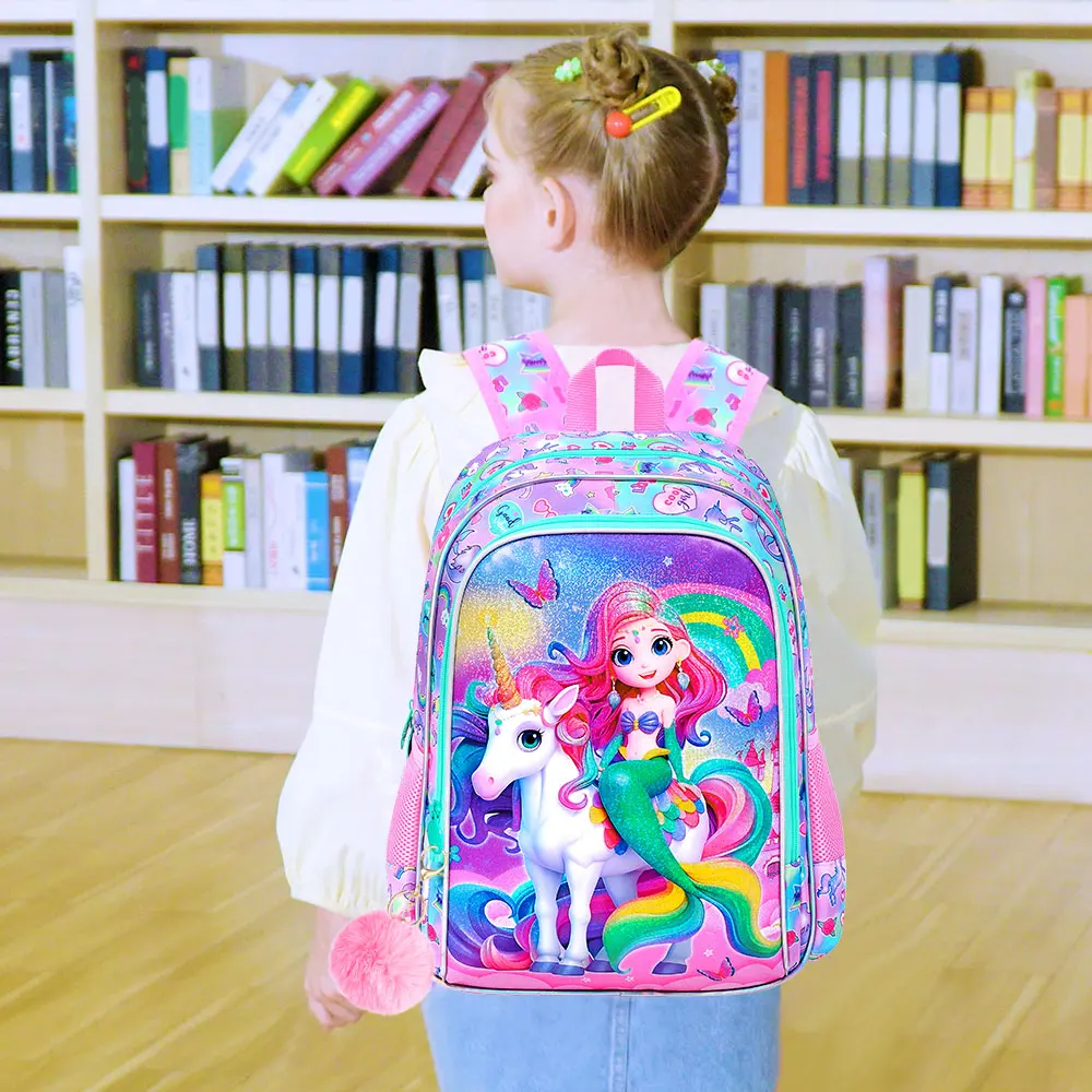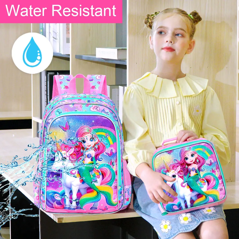 Kids Backpack Set Size: The girls bookbag set with cute mermaid UV printing, including girls backpack: 12"(L)x16"(H)*5"(W), lunch bag: 8.5"(L)*9.5¡±(H)*4"(W) , Pen bag: 8.66"(L)x4.72"(H)*0.2"(W).