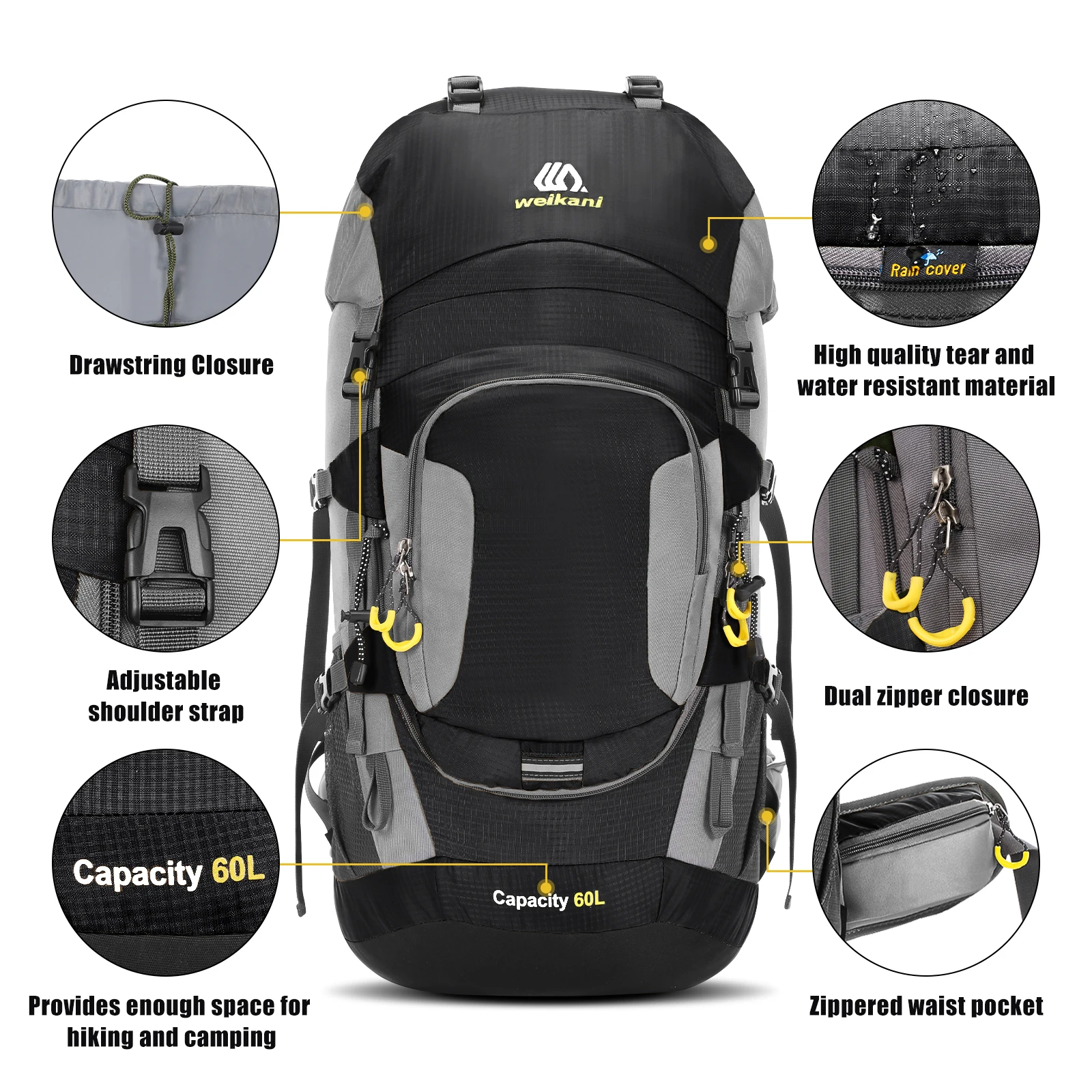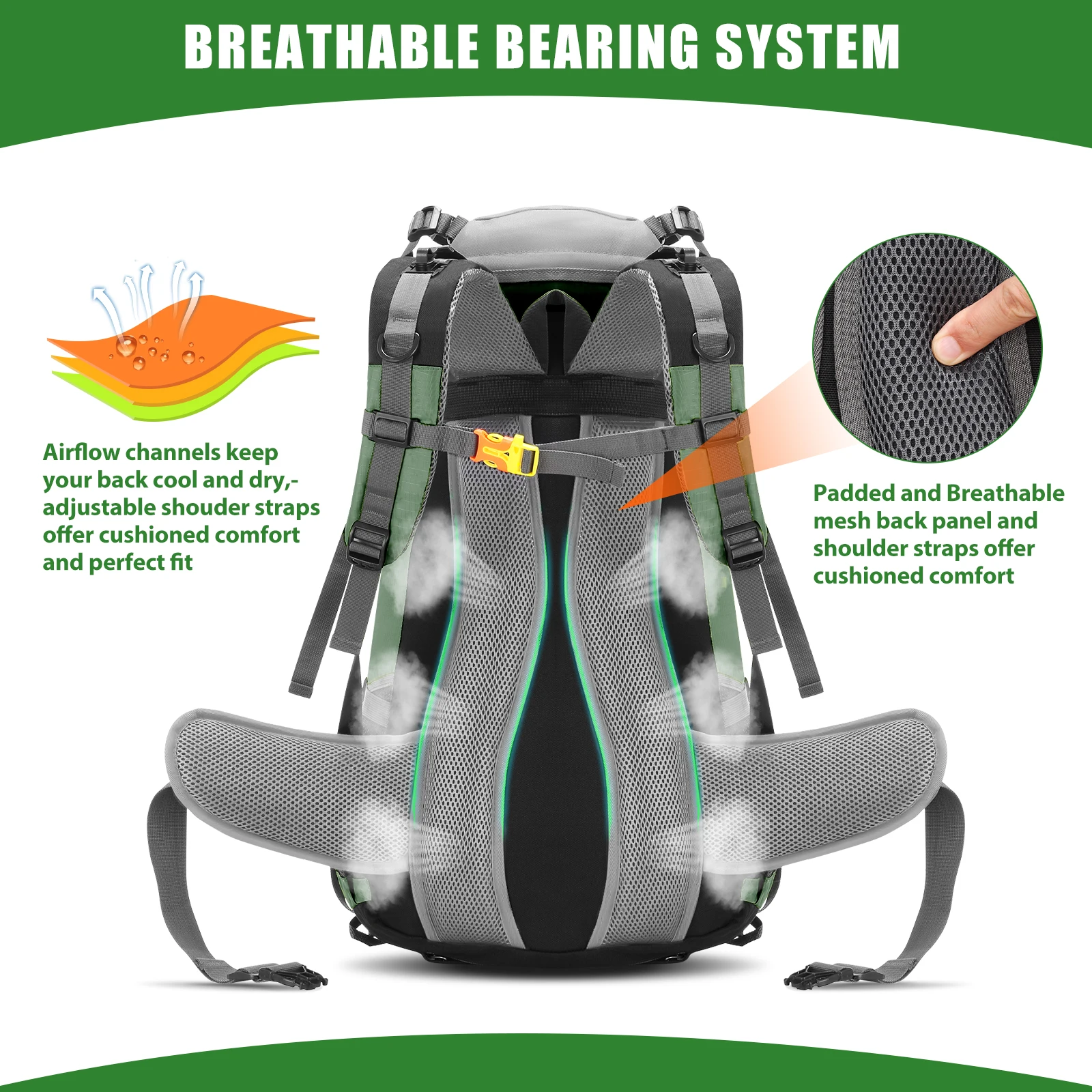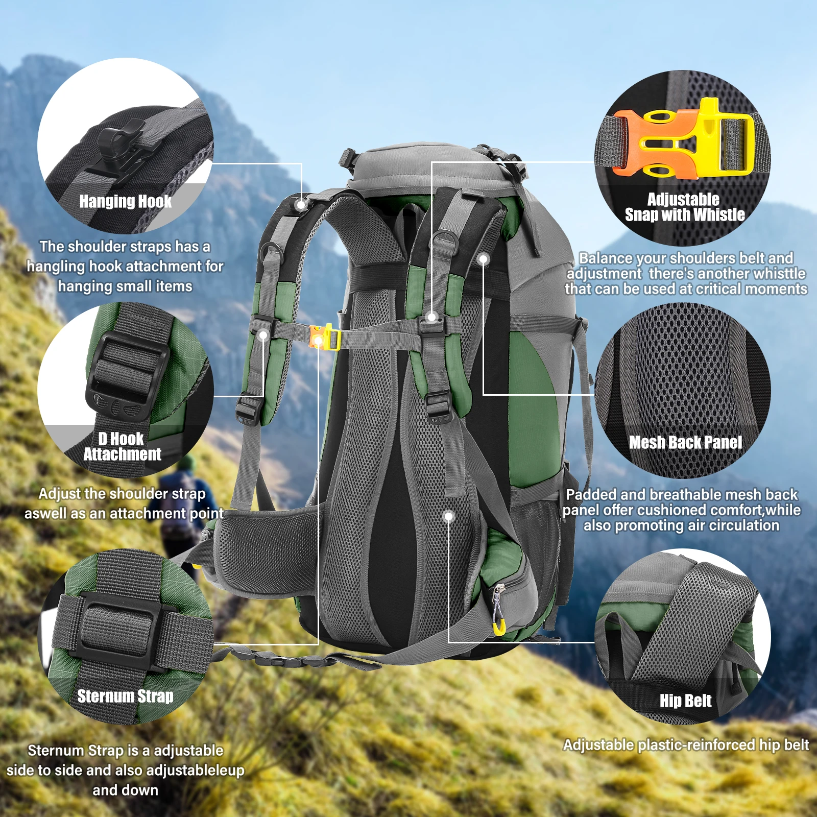 60L large capacity backpack with many pockets provide spacious storage space for your belongings, perfect for hiking, traveling, camping, mountaineering, and other outdoor activities.