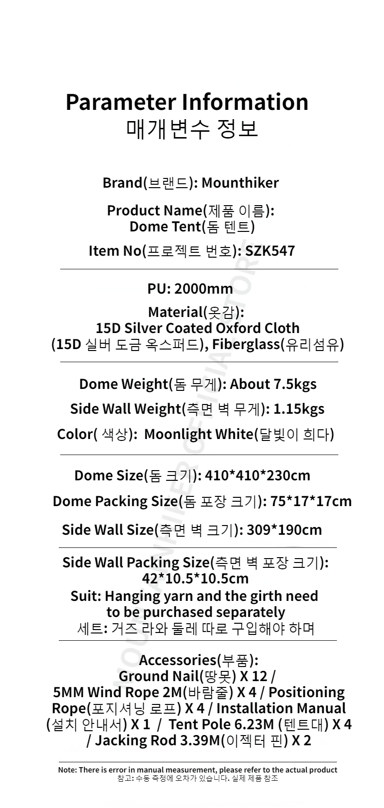 참고: 수동 측정에 오차가 있습니다. 실제 제품 참조