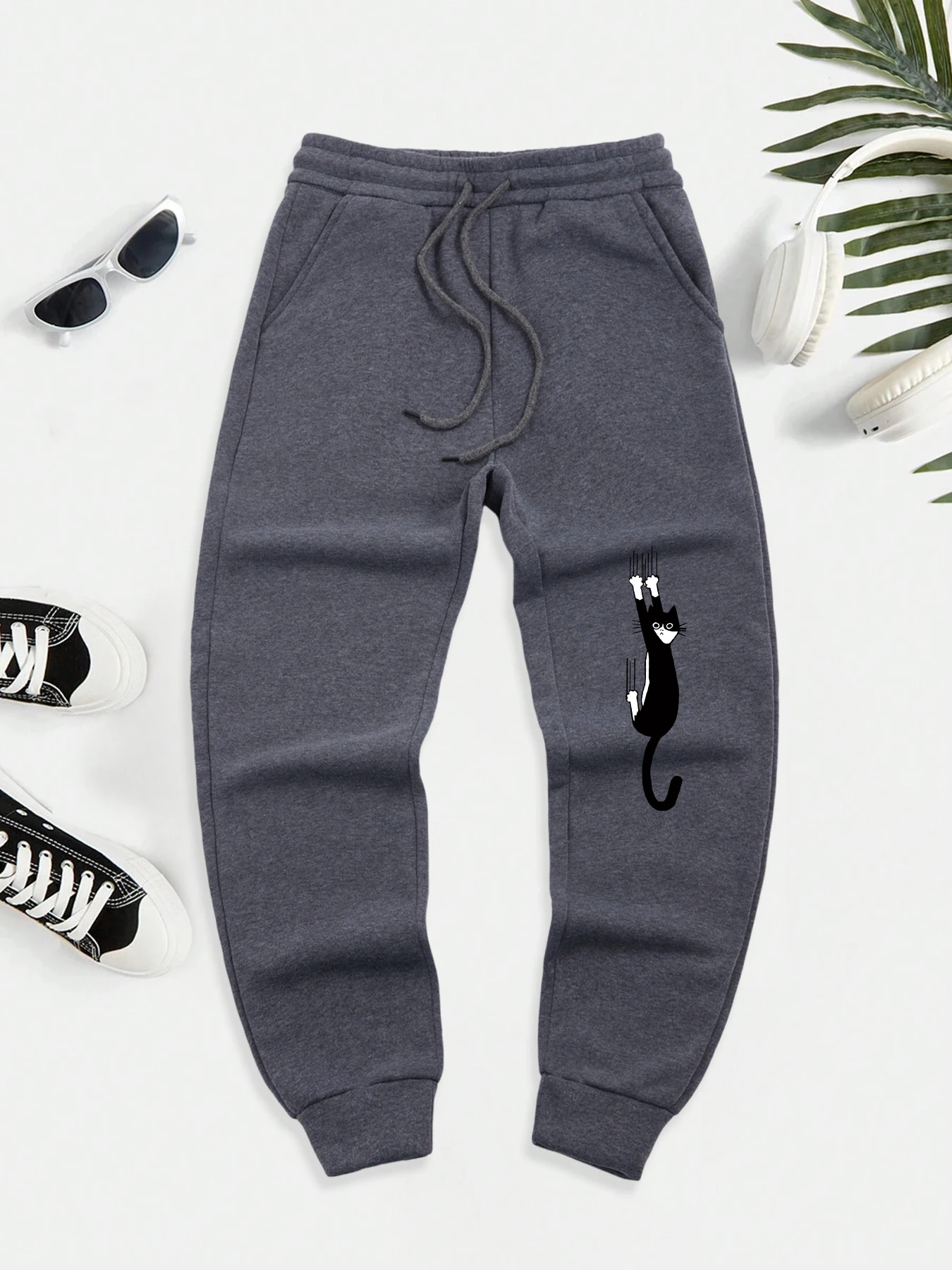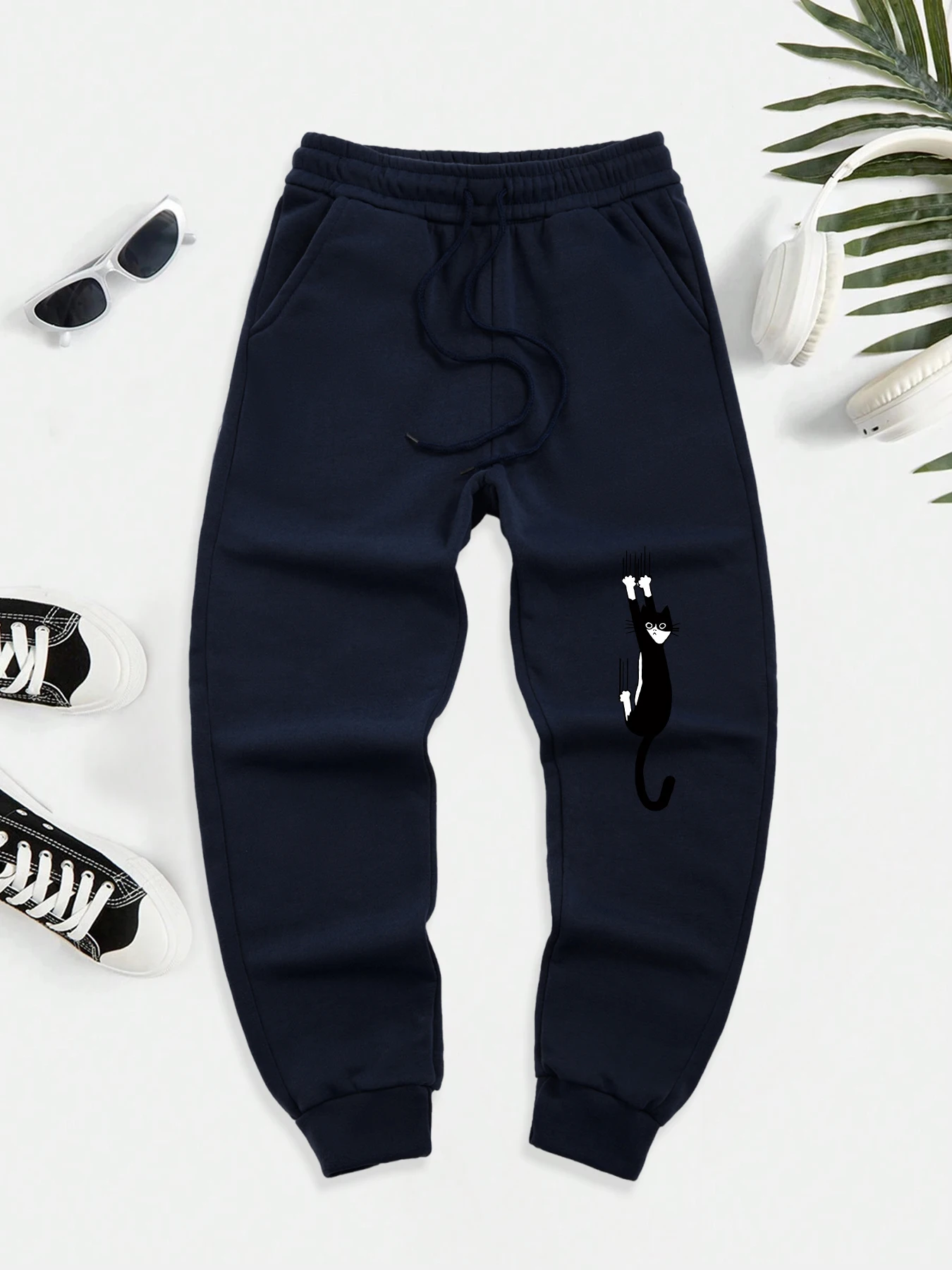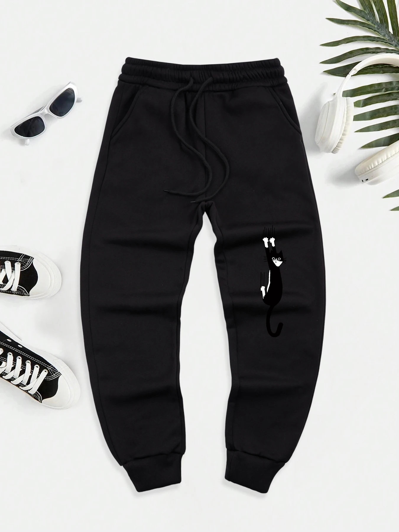 Black Cat Scratch Printed Men Autumn Warm Sweatpant Casual