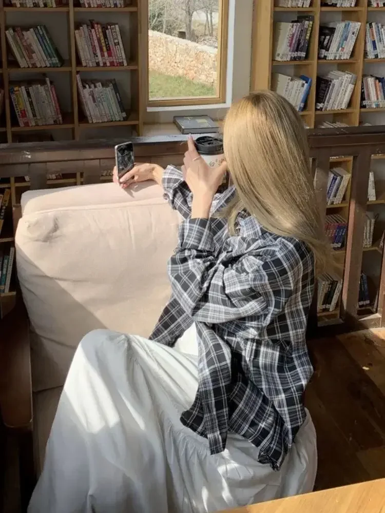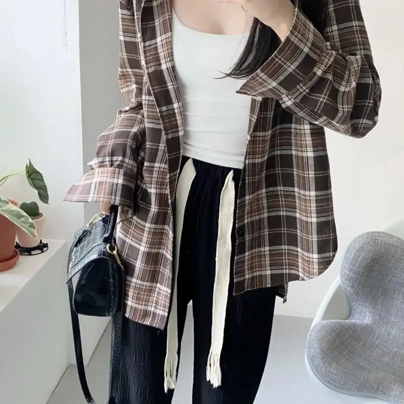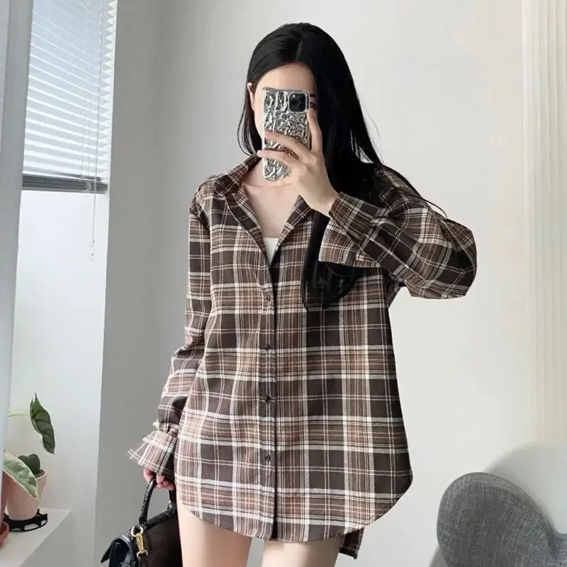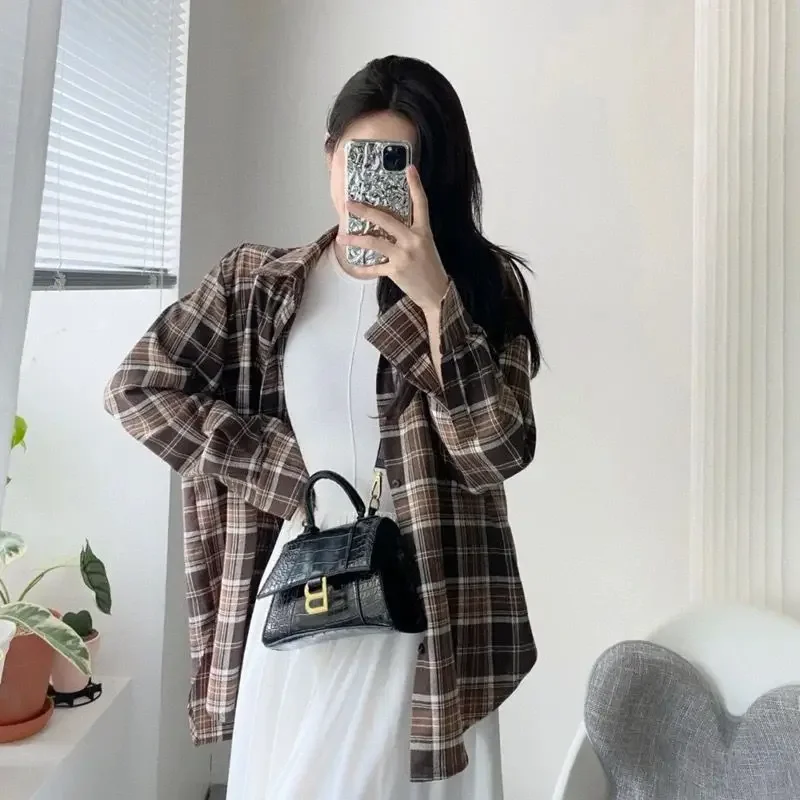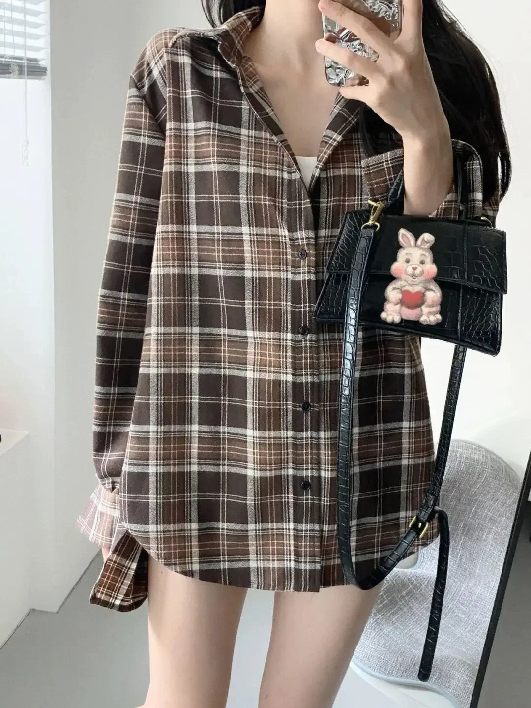 Caramel Plaid Long Sleeve Women's Shirt Casual Loose Style