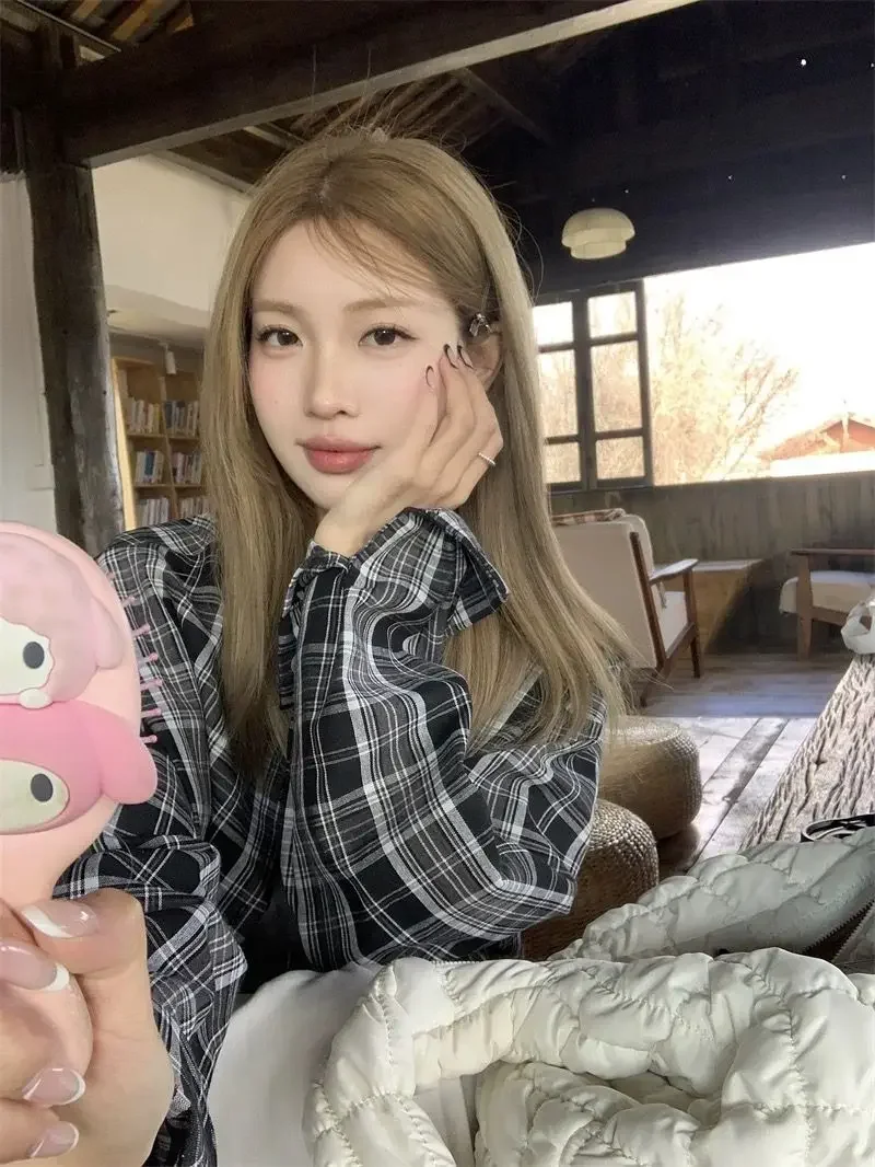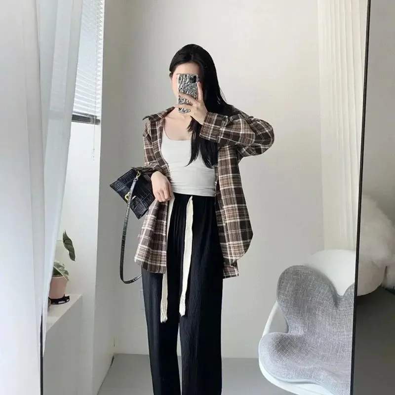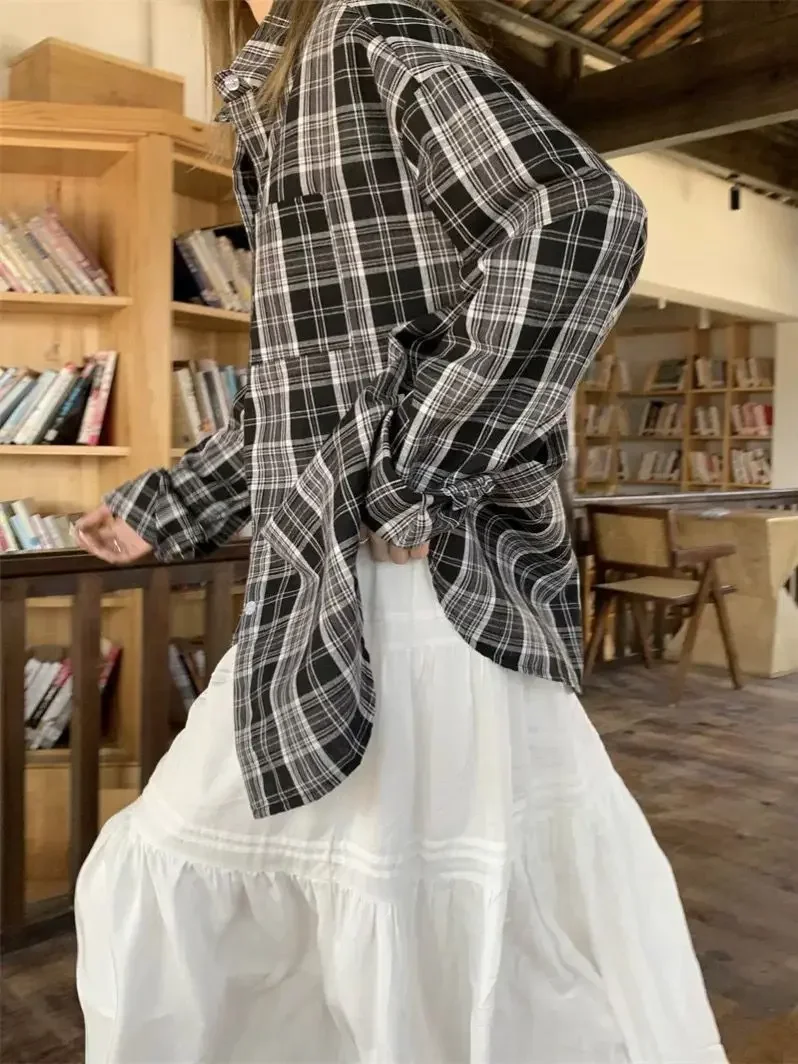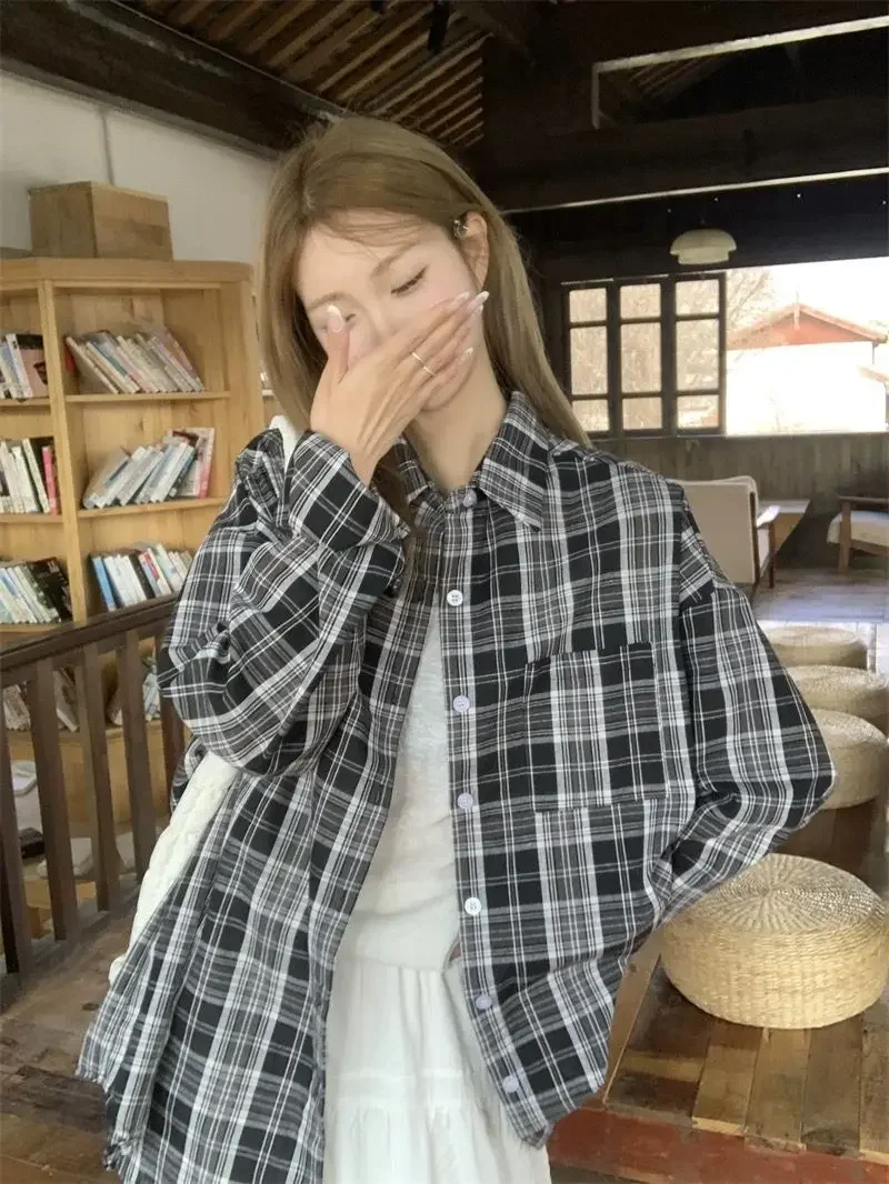 Caramel Plaid Long Sleeve Women's Shirt Casual Loose Style