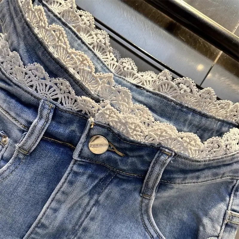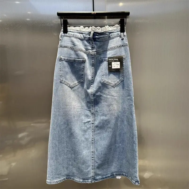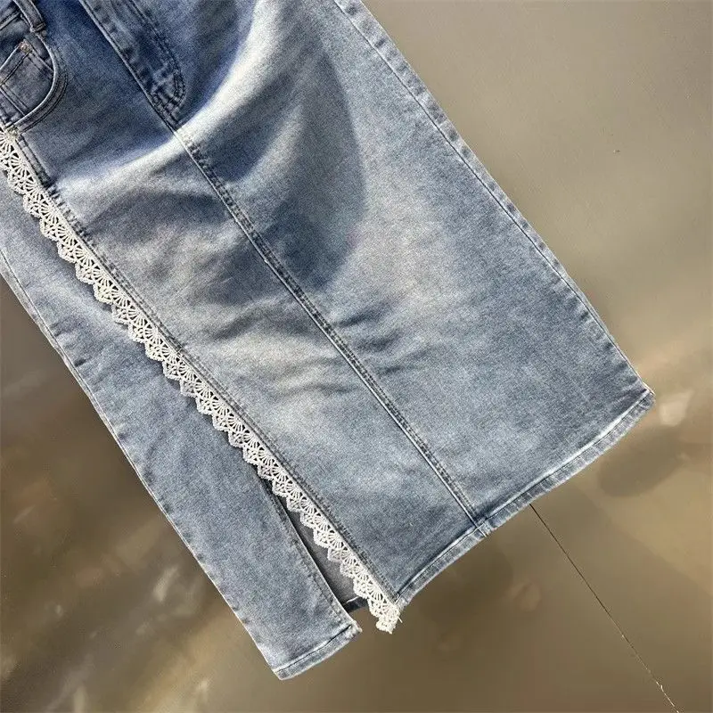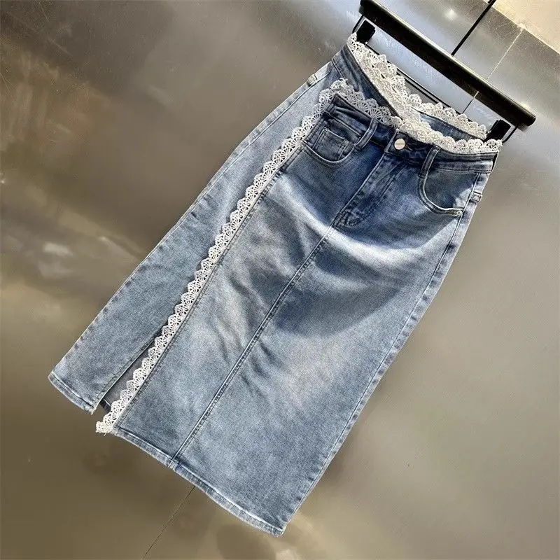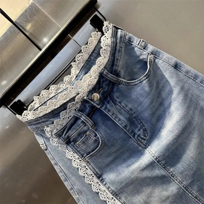 Casual High Waist Denim Skirt with Lace Trim Splice Design