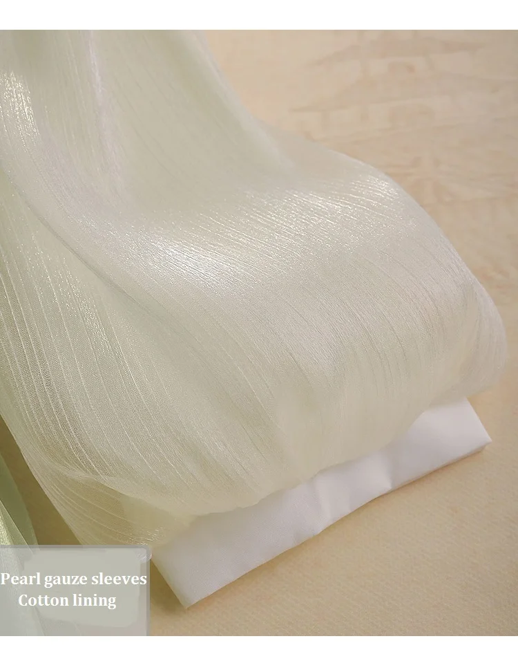 The outer fabric of the skirt jacket is satin, and the inner layer is pure cotton. Sleeves are mesh + spandex. The hemline is streamer gauze +2 layers of extra dense gauze + pure cotton lining