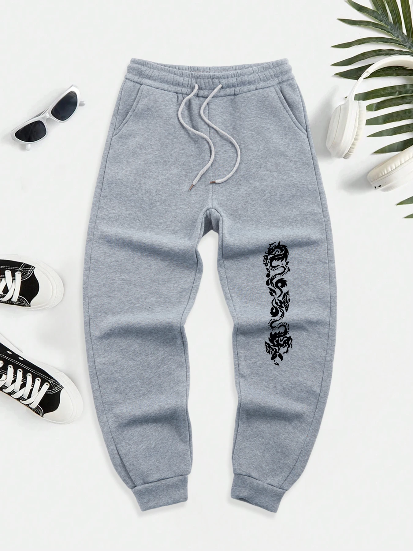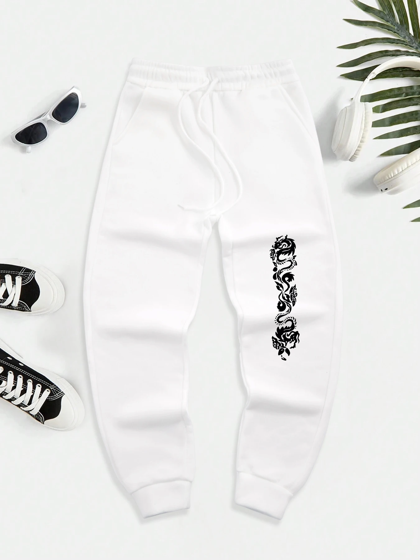 Creative Double Dragon Prints Sweatpants Men Street Fleece