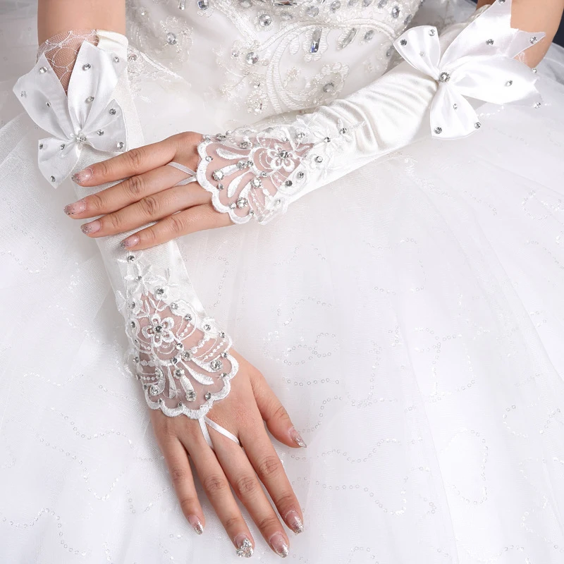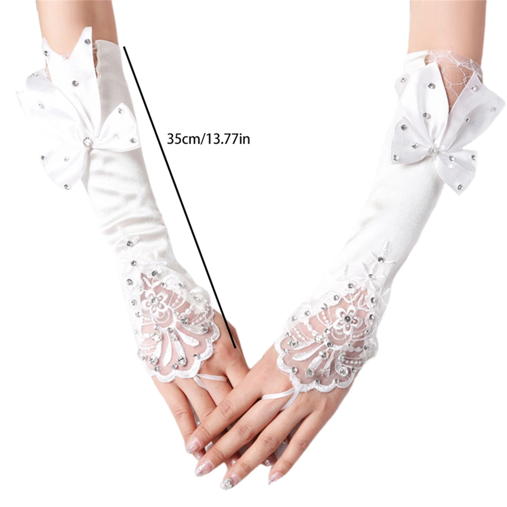 Bride Wedding Rhinestone Bowknot Lace Gloves White Fingerless Satin Gloves Bridal Accessories for Women Wedding Dinner PartiesSpecification: