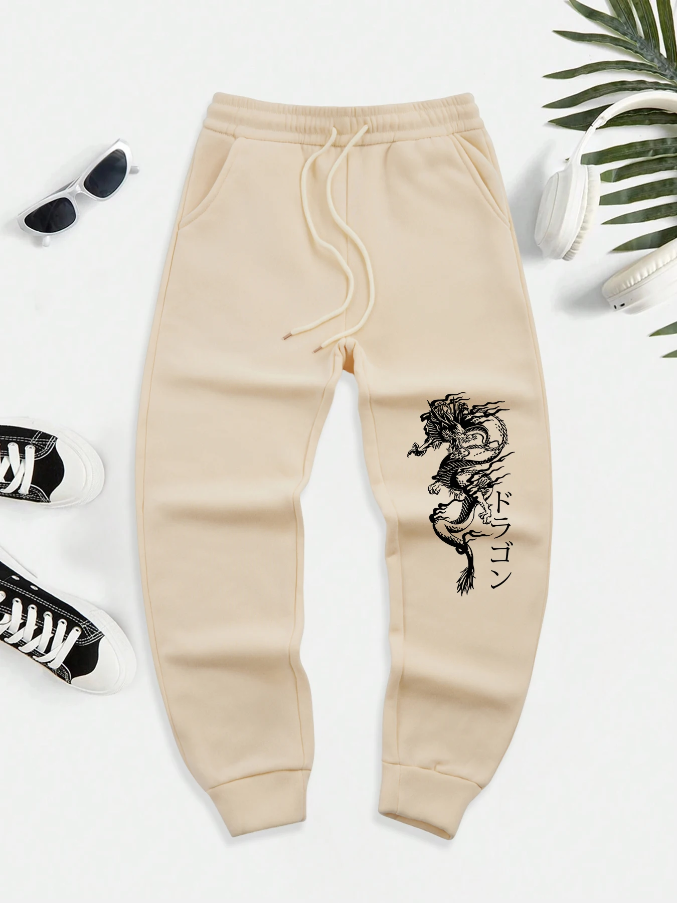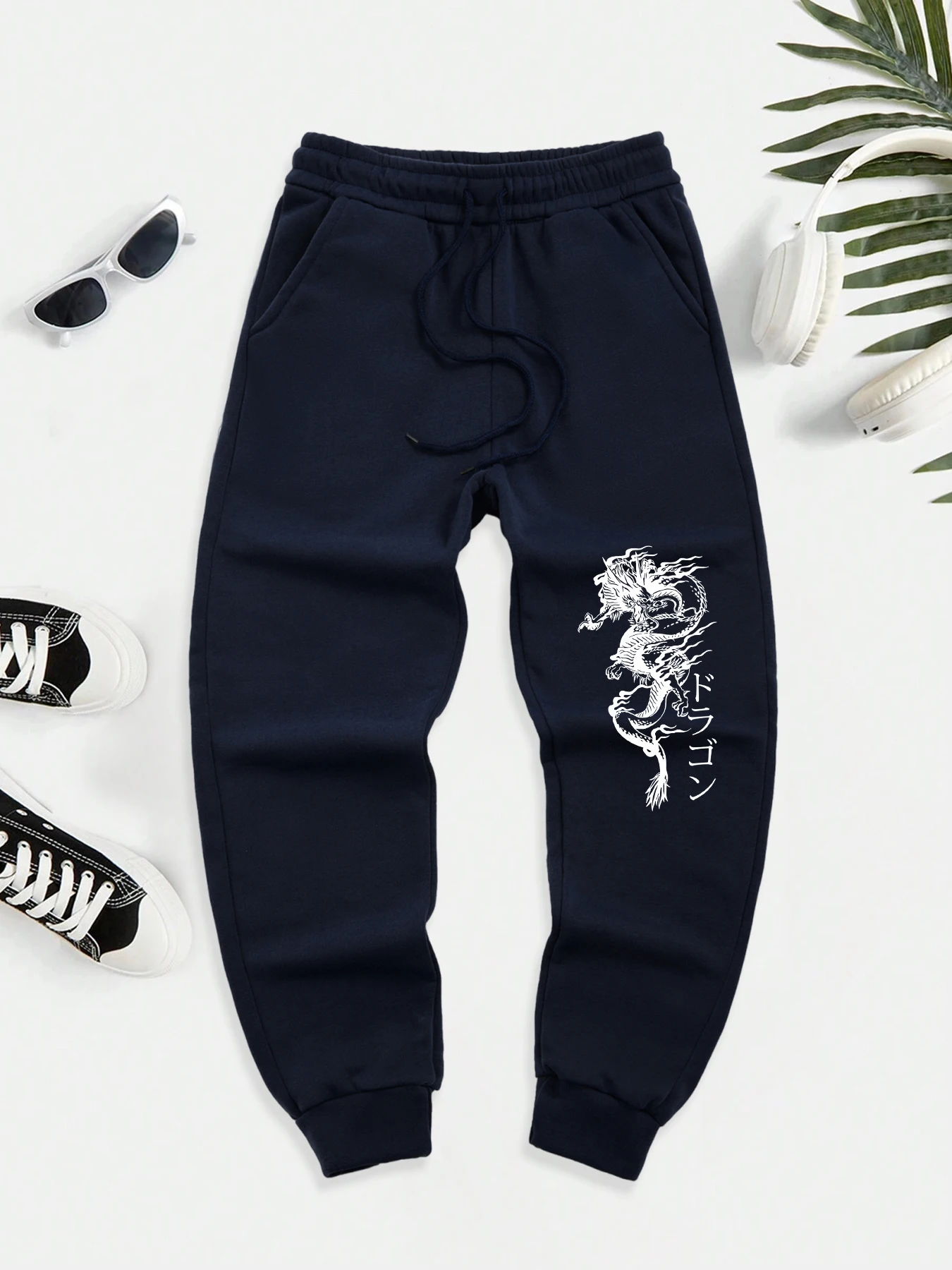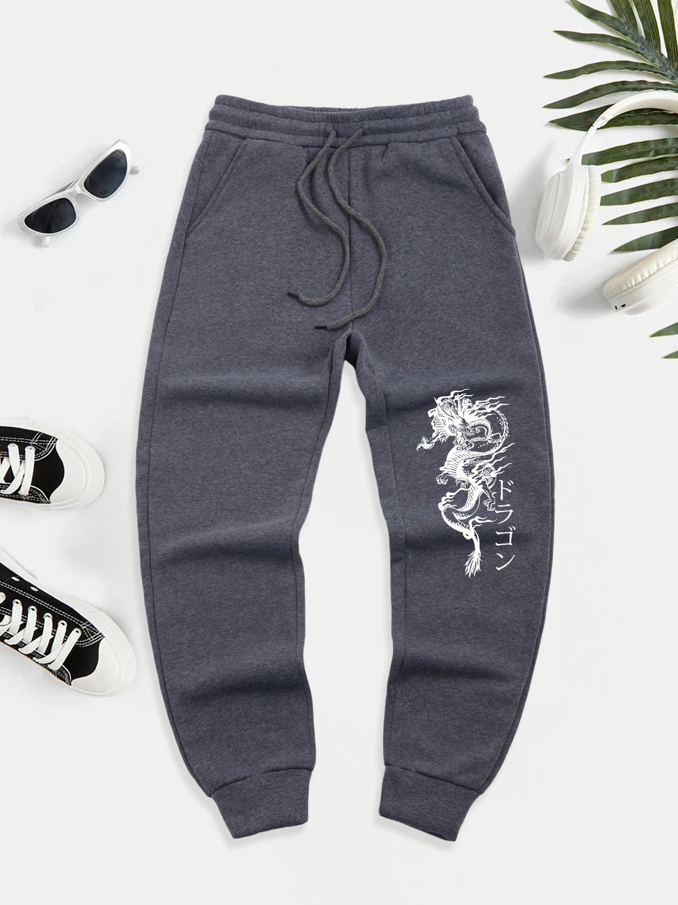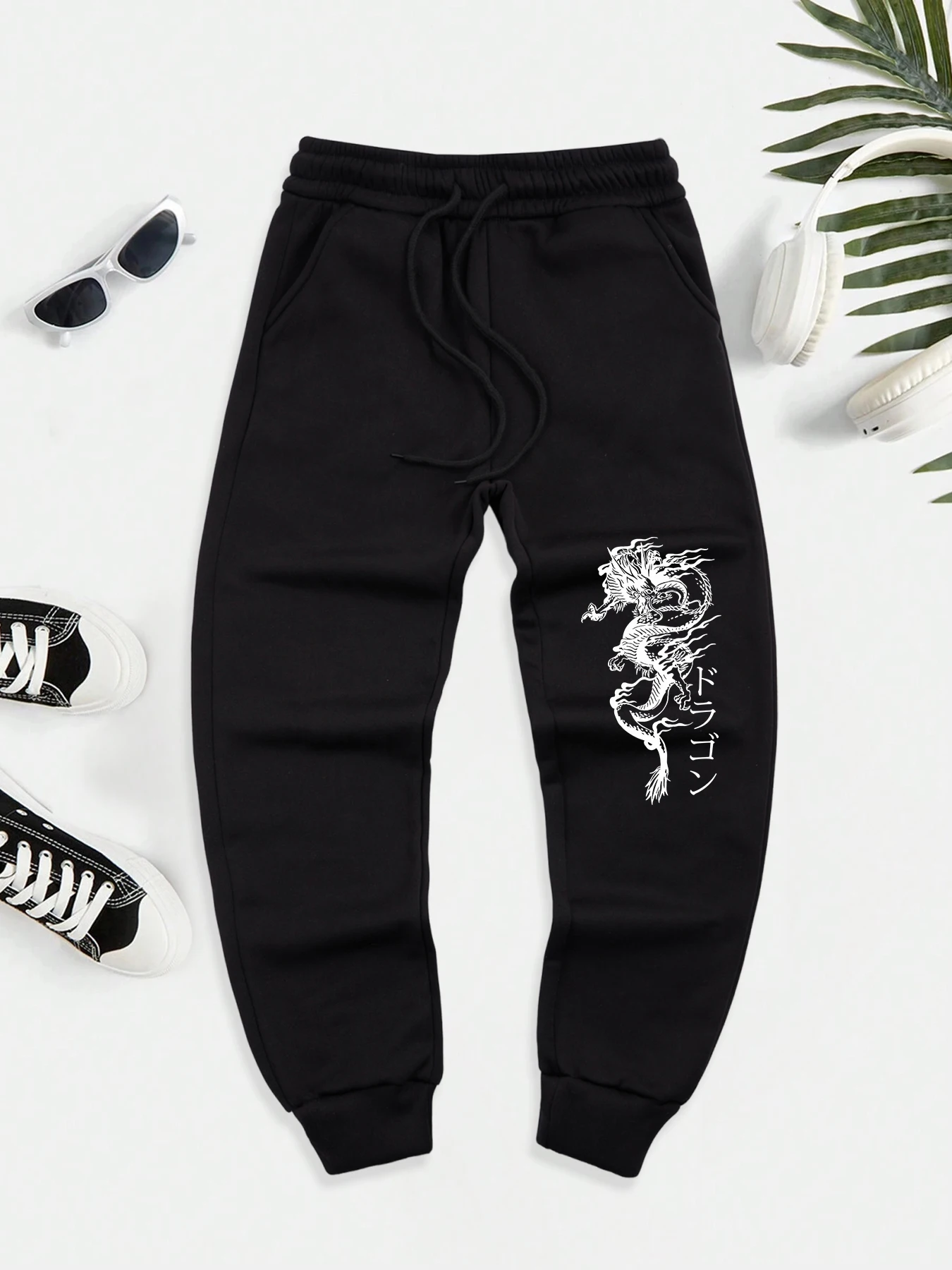 Japanese Word And Dragon Print Men New Warm Pants Fleece