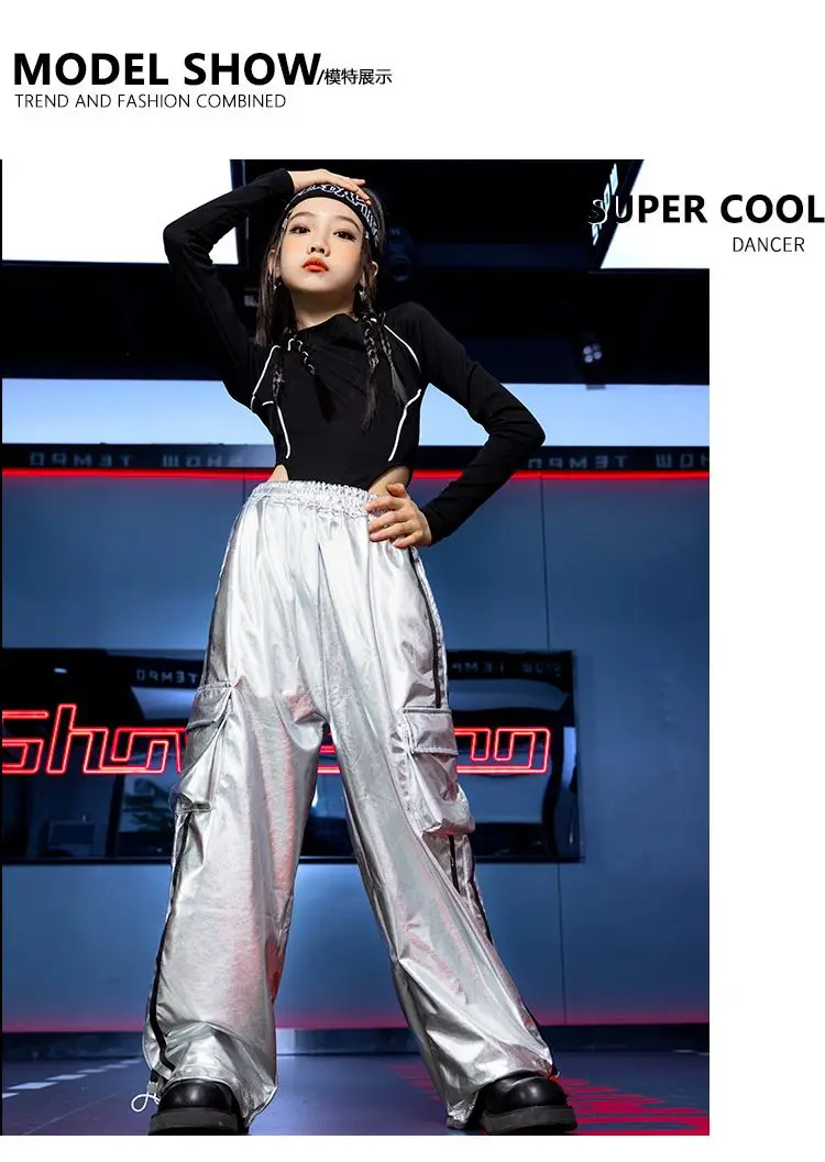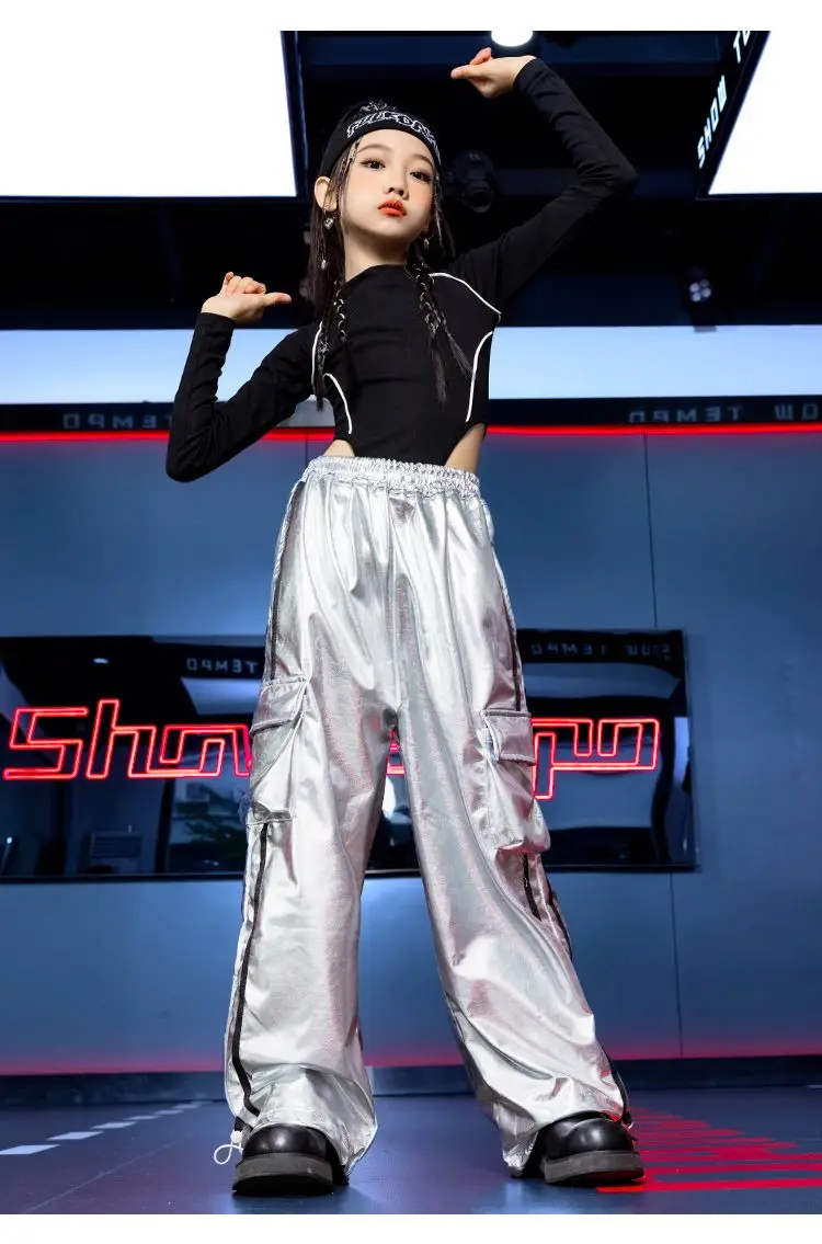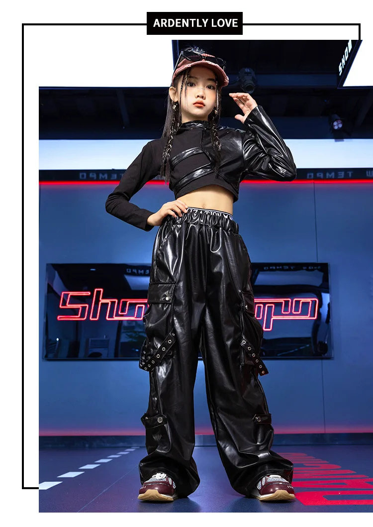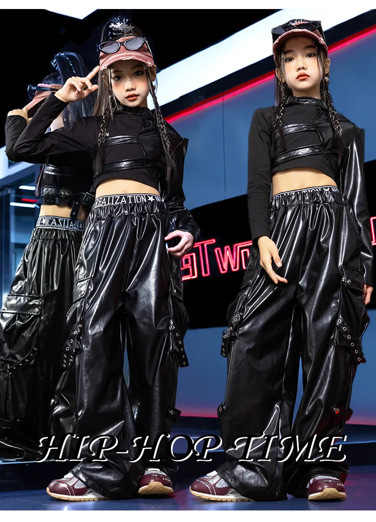 Jazz Dance Girls Clothes Kids Hip Hop Dance Costume Black Leather Crop Tops Hiphop Pants Catwalk Performance Clothing BL13600