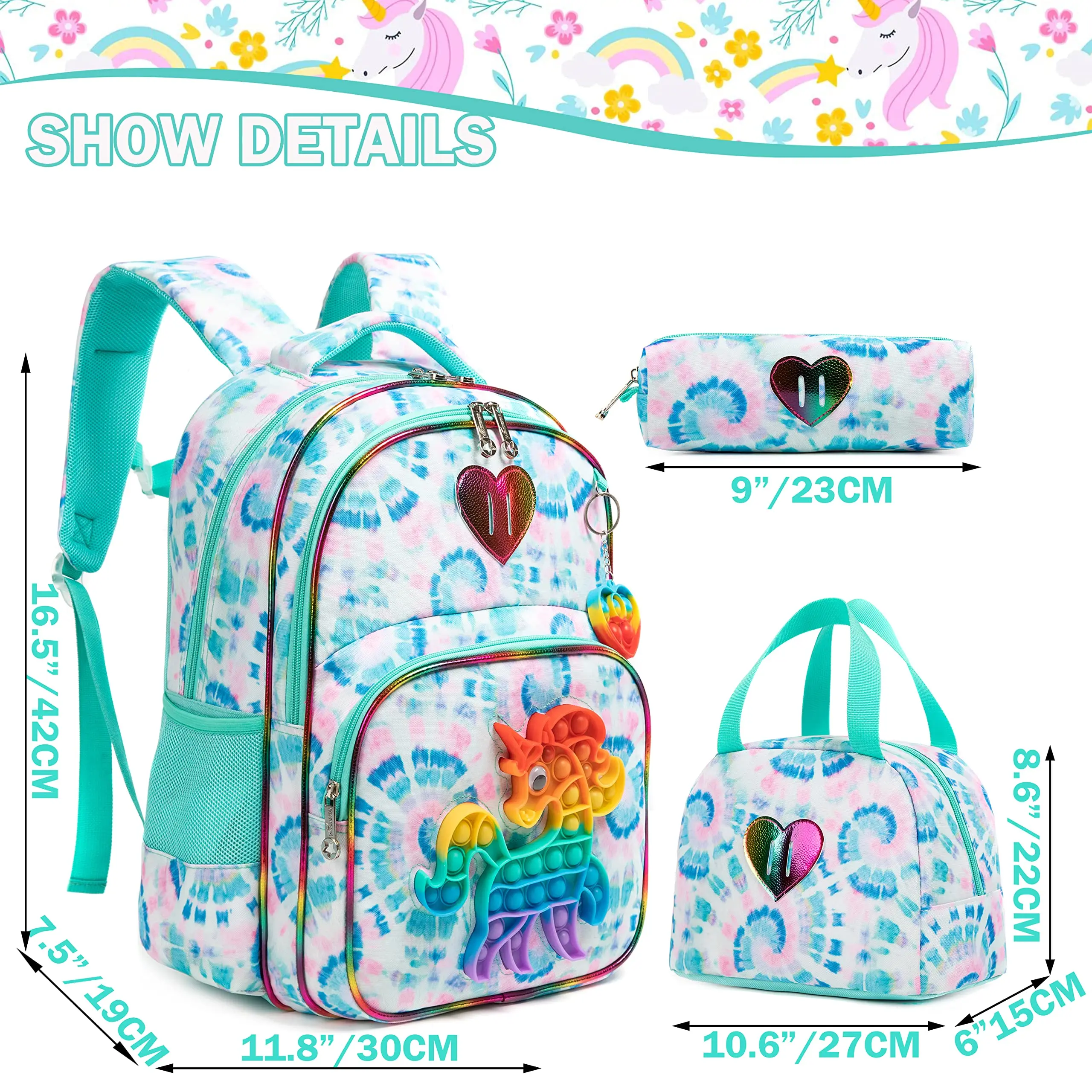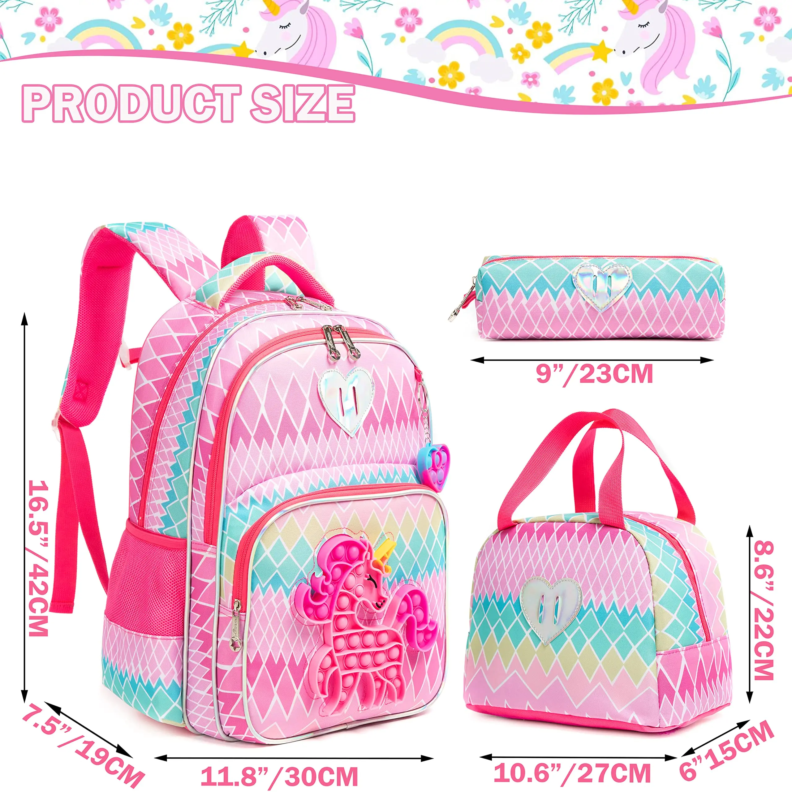 [Girls Unicorn Backapck Size]4 in 1 Backpack Set;You will get 1 Backpack,1 Lunch Box,1 Pencil case and 1 pendant. Backpack:16.5"X11.8"X7.5"Lunch Box:9X8.2"X4.3"Pencil Case:9"