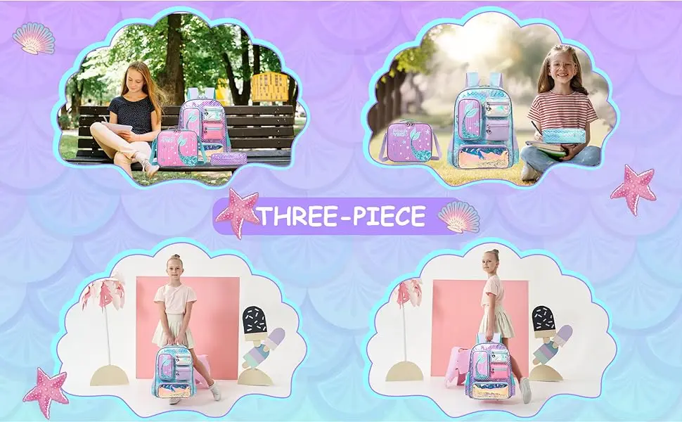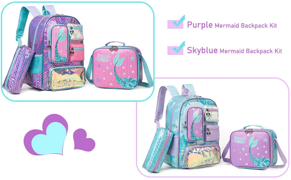 [Girls Mermaid Backpack Size]:Backpack:16.5"X11.8"X6.6" ;Lunch Box:7.8"X9"X3.5";Pencil Case9“ Love plush pendent is Included.