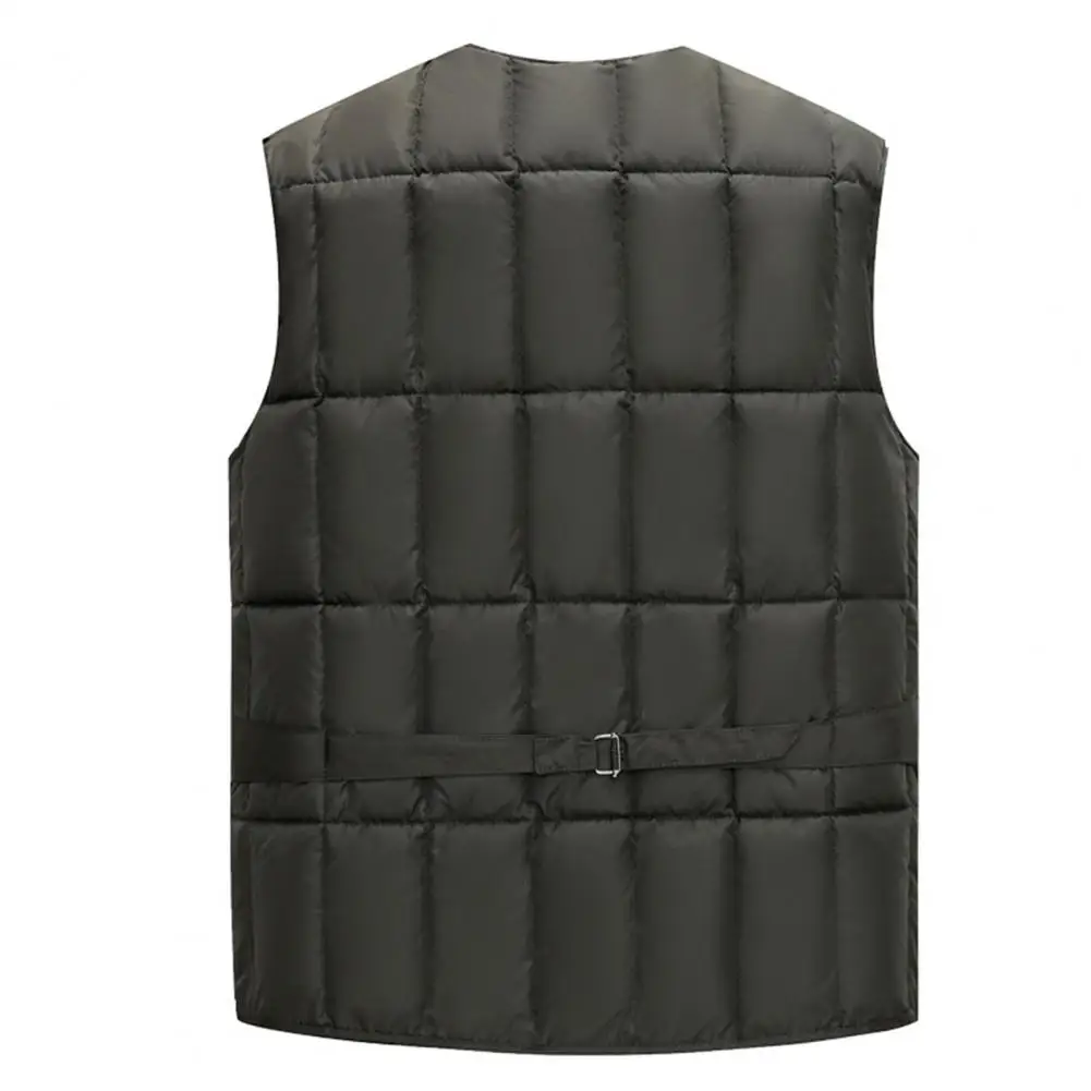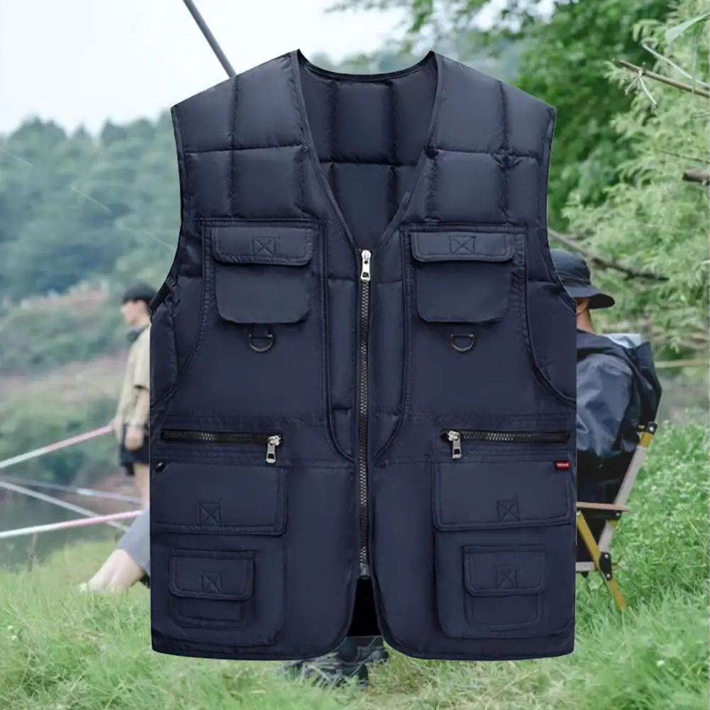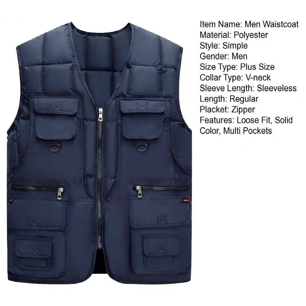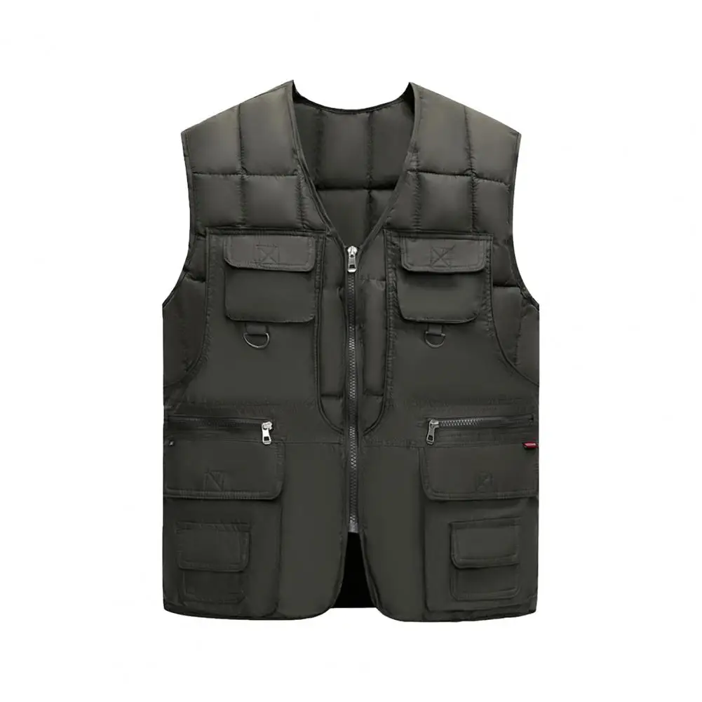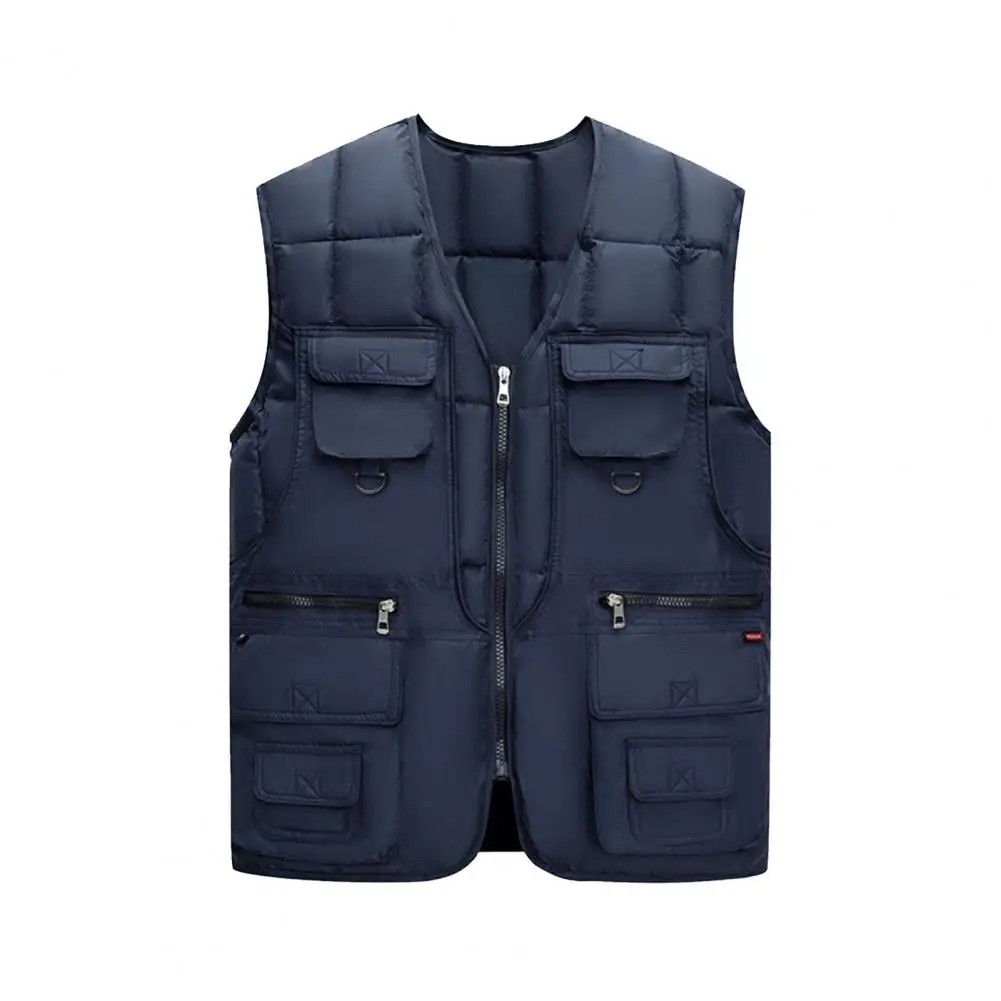 Men Waistcoat V-Neck Sleeveless Zipper Placket Vest Coat with Multi Pockets Solid Color Windproof Warm Down Vest Jacket