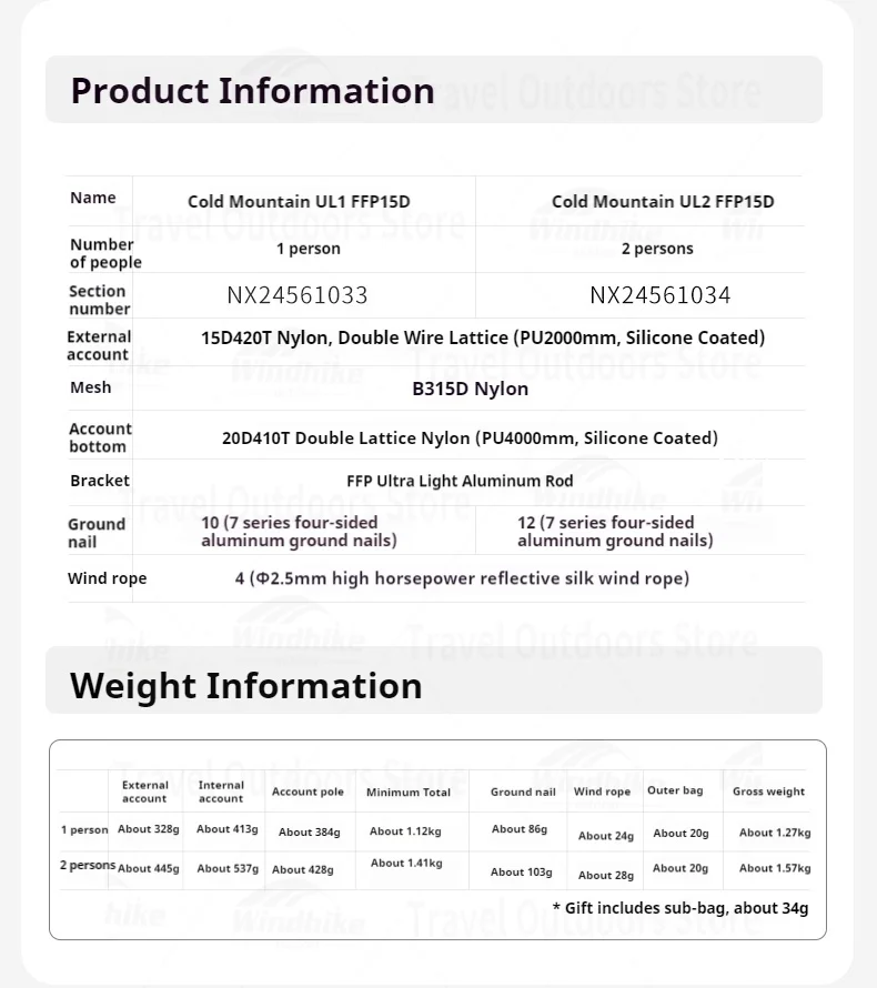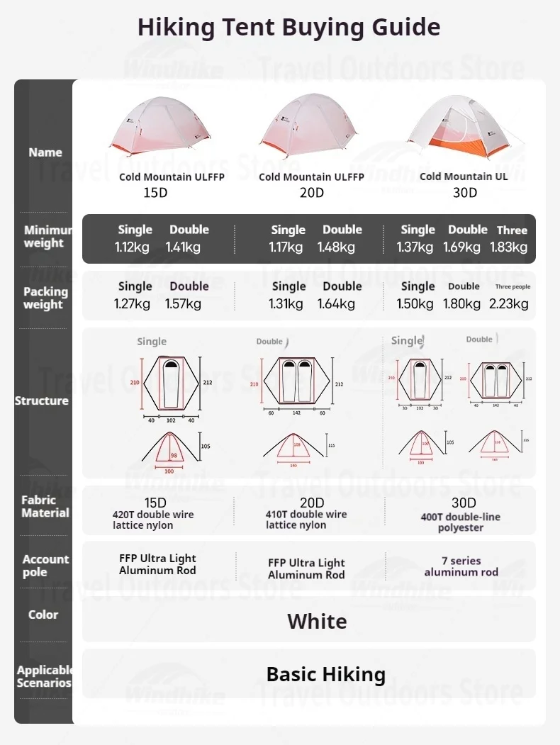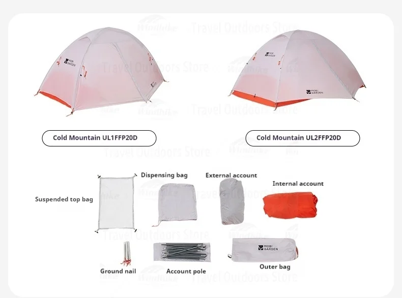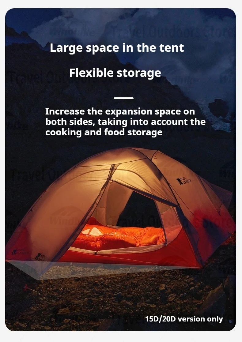 Outer tent: 15D420T double-line nylon (PU3000mm, silicone coated)
