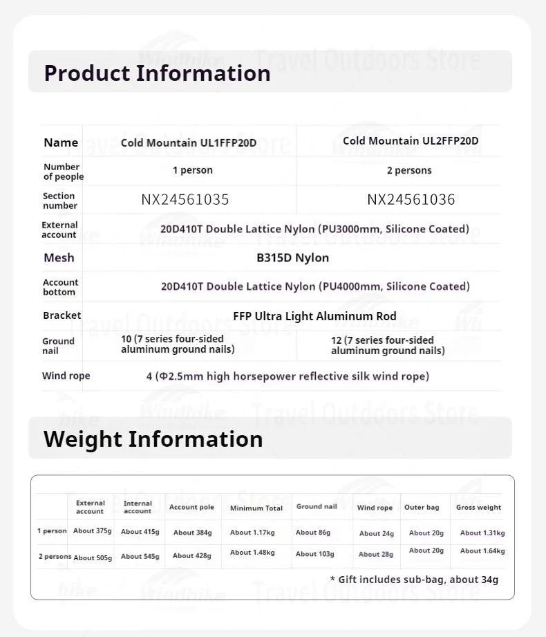 Outer tent: 20D410T double-line nylon (PU3000mm, silicone coated)