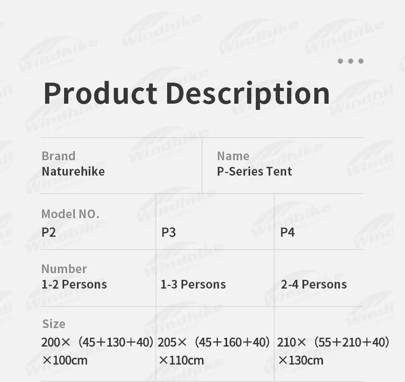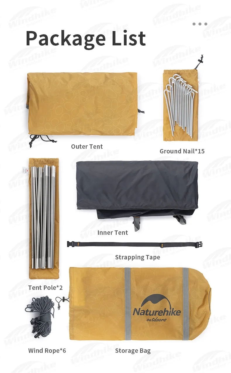 Package List: Outer Tent / Inner Tent / 7001 Aluminum Alloy Tent Pole*2 / 17cm Aluminum Alloy Ground Nail*15 / 250cm Wind Rope*6 / Storage Bag / Strapping Tape