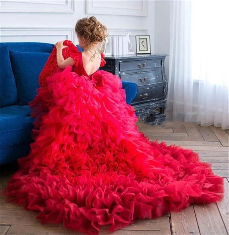 Red Gauze Ball Gown Dress for Girls Princess Style Floral