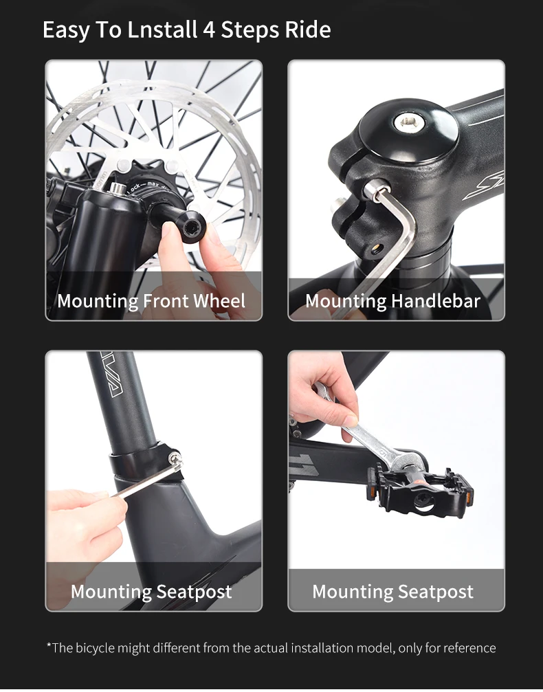 The bike is 95% assembled at the factory and free assembly tools and pedals are provided. After receiving the goods, you just need to install the fork, front wheel, seat post and pedals, and ready to ride. (Please consult the seller). You can easily finish the assembly in 10-20 minutes.