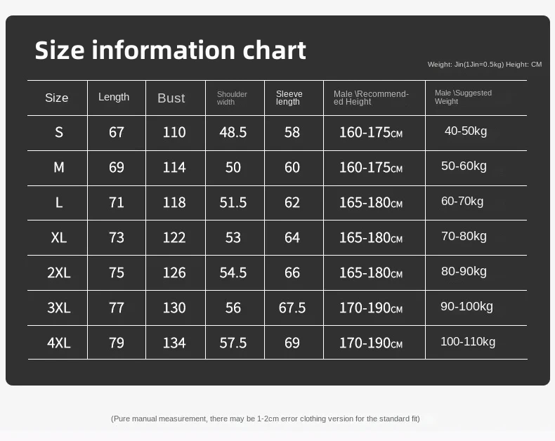 size_info: {"sizeInfoList":[{"length":{"cm":"110","inch":"43.31"},"size":"S 40-50KG","vid":-1},{"length":{"cm":"114","inch":"44.88"},"size":"M 50-60KG","vid":-2},{"length":{"cm":"118","inch":"46.46"},"size":"L 60-70KG","vid":-3},{"length":{"cm":"122","inch":"48.03"},"size":"XL 70-80KG","vid":-4},{"length":{"cm":"126","inch":"49.61"},"size":"XXL 80-90KG","vid":-5},{"length":{"cm":"130","inch":"51.18"},"size":"XXXL 90-100KG","vid":-6},{"length":{"cm":"134","inch":"52.76"},"size":"4XL 100-110KG","vid":-7}]}