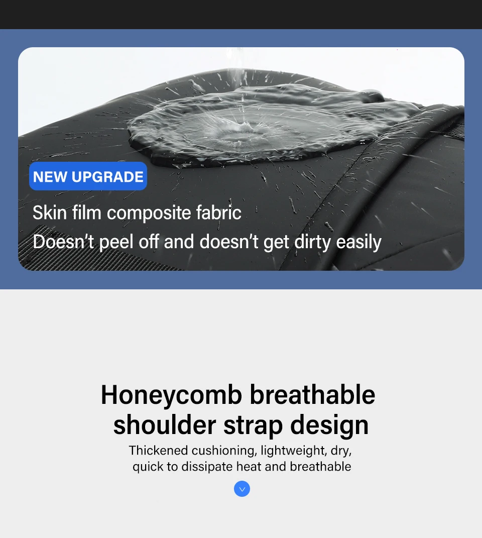 4. Ergonomic back design, Luggage strap, and breathable load reduction and heat dissipation design