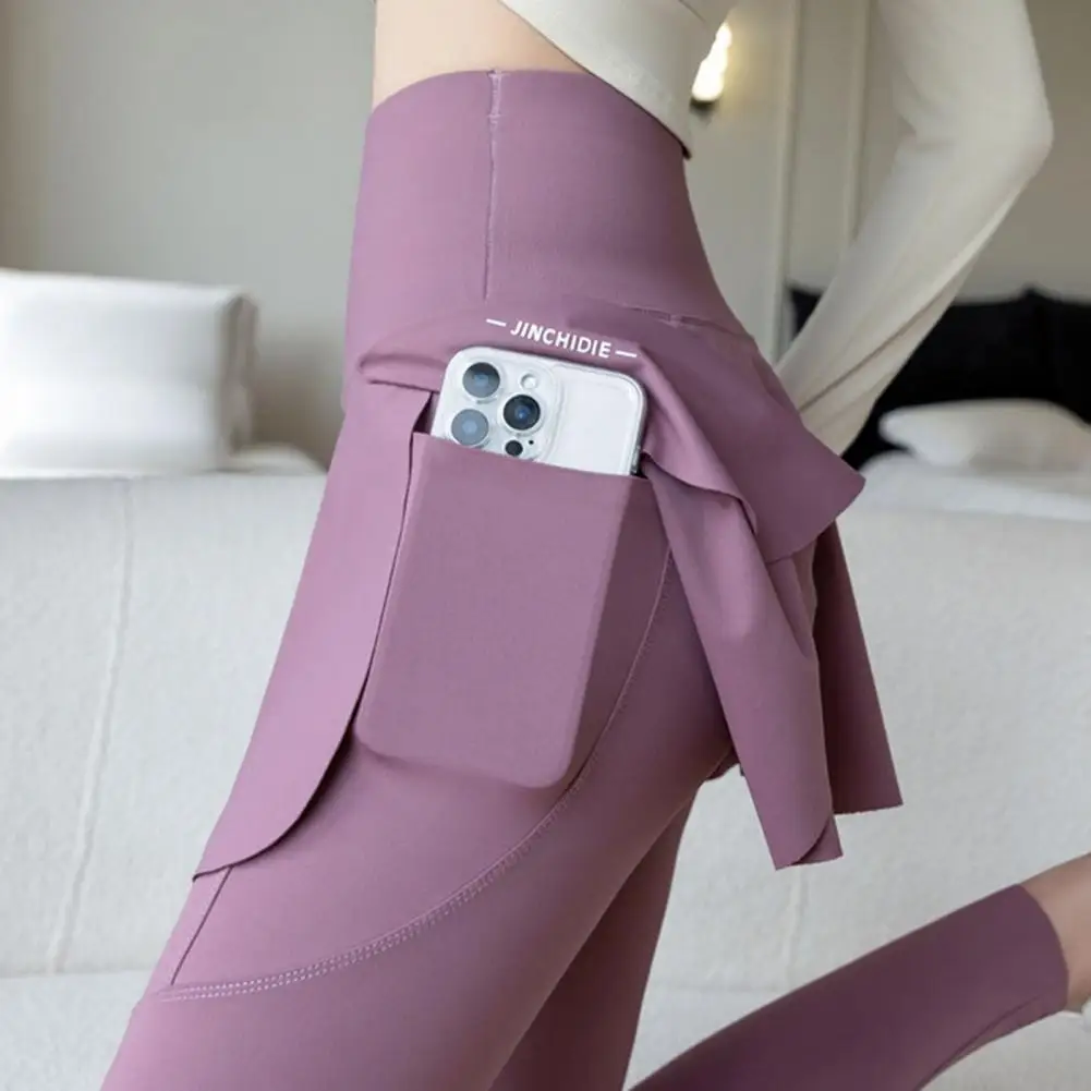 Women Yoga Pants Fake Tow-piece Skirt Patchwork Skinny Compression High Waist Phone Pocket Butt-lifted Anti-exposure Seamless Sport Gym Jogging Trousers